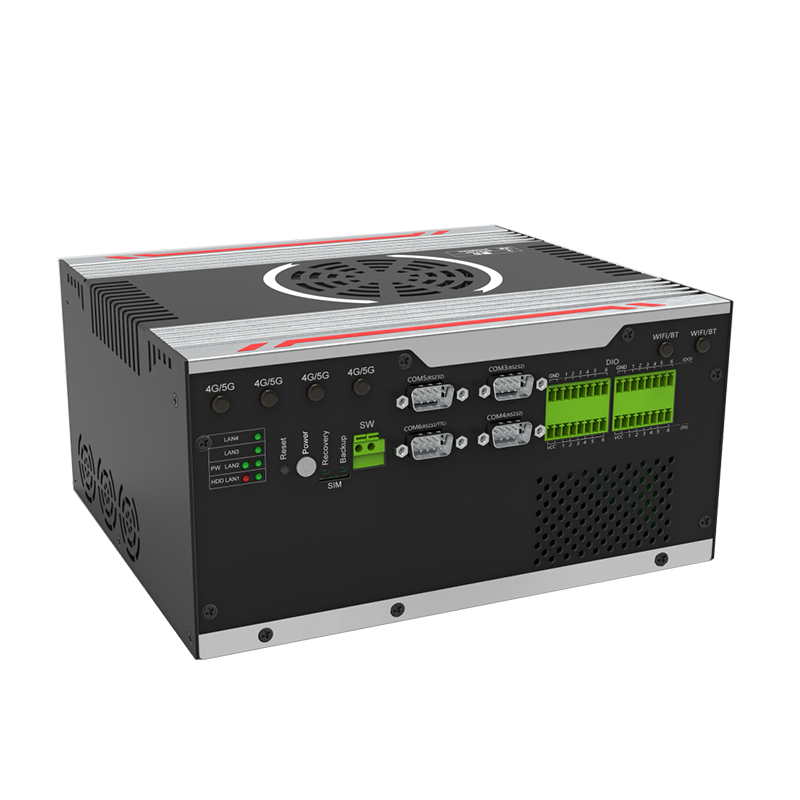 與豎向等多種放置的自然對流散熱,機箱可抗接觸式6KV強電磁干擾,DC12V-24V寬壓輸入接口豐富:4*LAN(Intel),6*COM,24*GPIO(12*GPI,12*GPO,帶隔離)10*USB,1*VGA,1*HDMI,1*遠