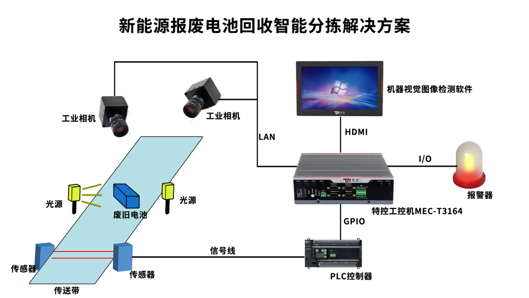 特控MEC-T3164具有超強的計算能力,在電池回收應(yīng)用場景中,搭載光源、相機和通信模塊等可快速檢測出電池的損壞、老化和容量等問題,實現(xiàn)對電池的分選和識別,為后續(xù)的回收和再利用提供了準(zhǔn)確的判斷依據(jù),避免了極片,電池材料,貴金屬的混雜,提高了資源利用效率;除此之外,還能收集廢舊電池轉(zhuǎn)化效率數(shù)據(jù),為后期成本分析提供依據(jù)。